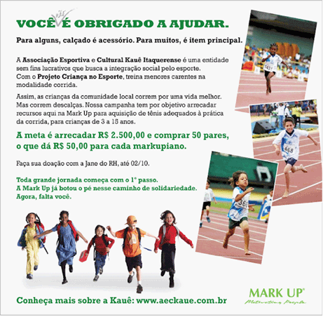 "FUNCIONÁRIOS DA MARK UP FAZEM CAMPANHA PARA COMPRA DE TÊNIS E AJUDAM CRIANÇAS DO PROJETO A.E.C. KAUÊ A SONHAR COM A OLIMPÍADA DE 2016. |